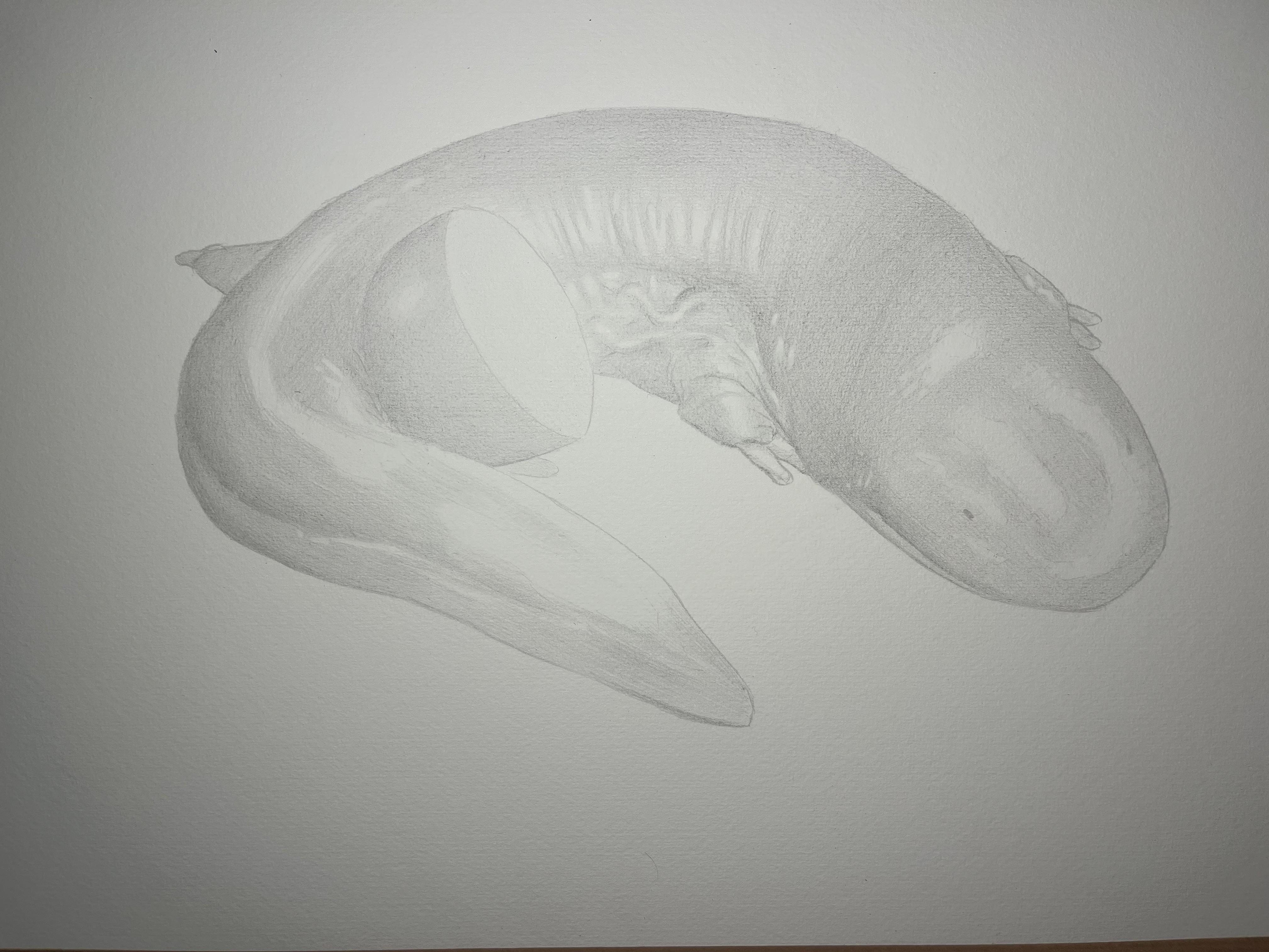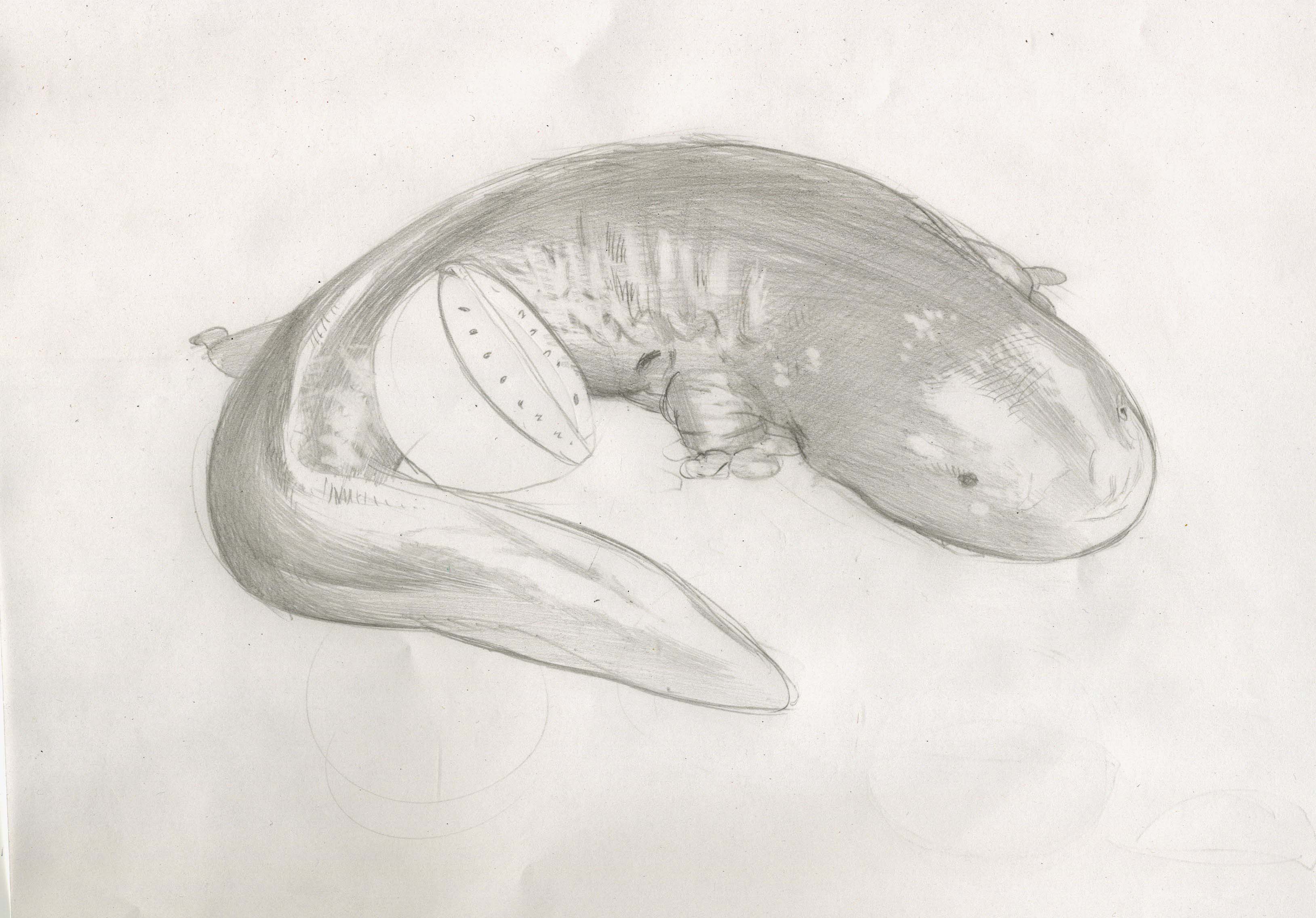 A giant asian salamander with a watermelon.